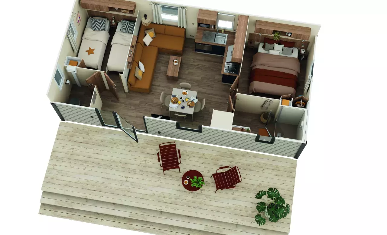 MOBIL HOME NEUF 2 CHAMBRES AVEC UN BEL ESPACE DE VIE; UNE SALLE D'EAU ET DES WC SEPARES